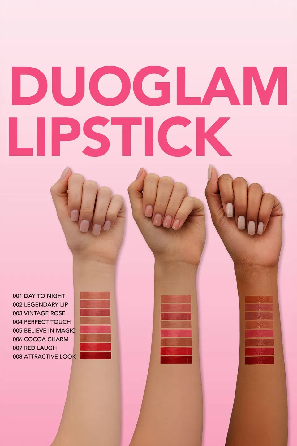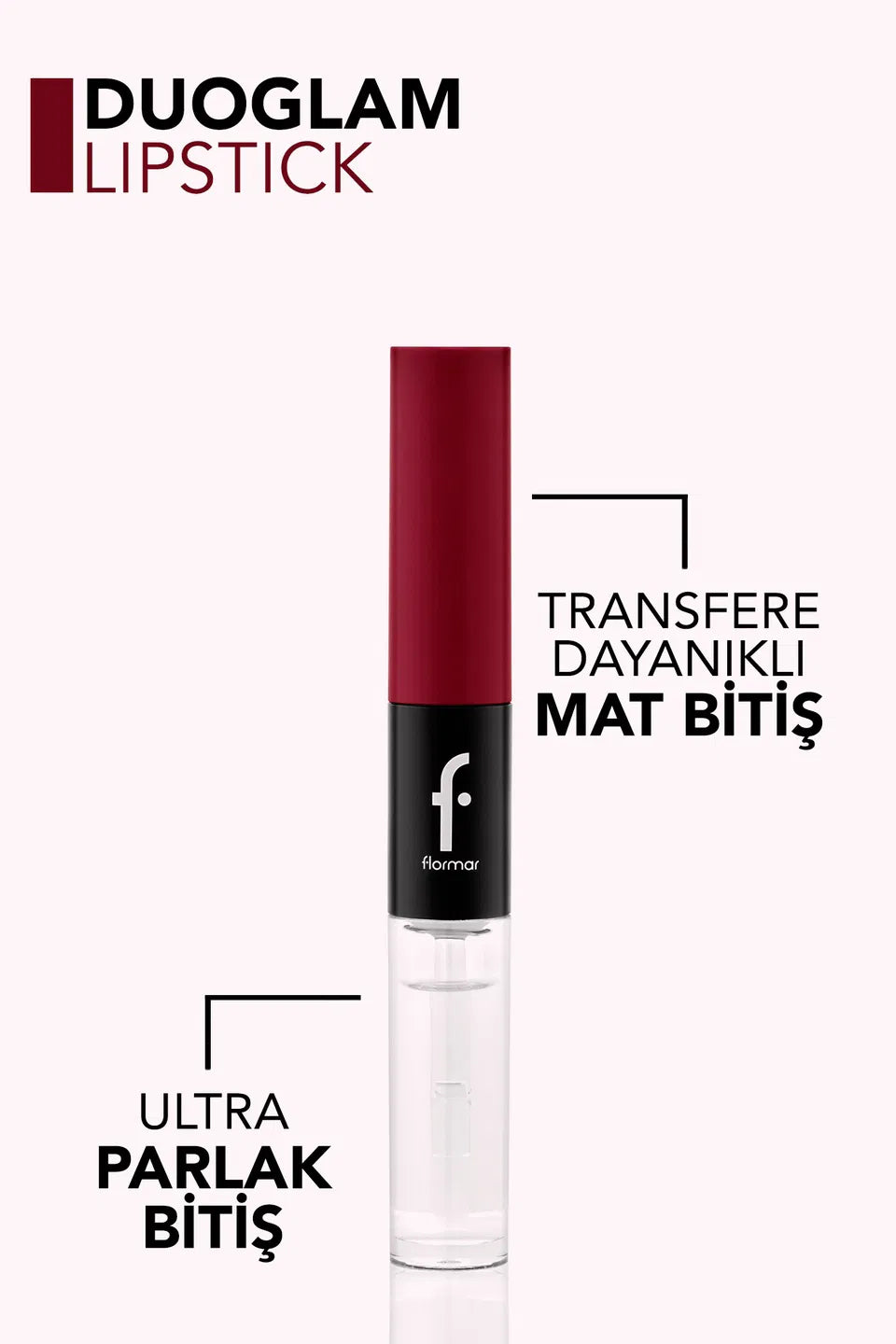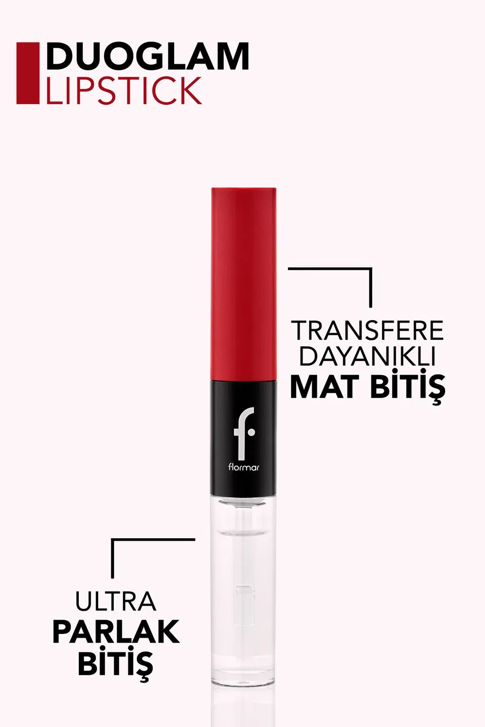 Do you want your favorite color to stay on your lips all day long with intense and eye-catching shine? Here's the product you're looking for: Flormar Duoglam High Pigment Creamy Liquid Lipstick & Ultra Long-lasting Lip Gloss! This dual-ended liquid lipstick and lip gloss, offering a practical and easy application, instantly gives your lips a bold and attractive look.